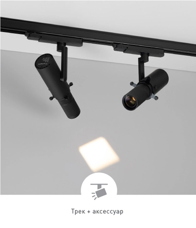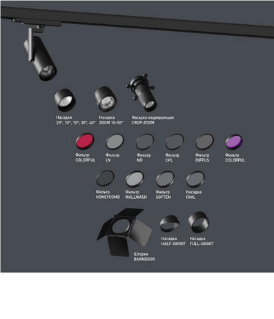 Насадки с изменяемым углом 10–50° и фиксированными углами 10, 15, 30 и 40° позволяют подобрать подходящие под объект акценты; овалорисующая и кадрирующая насадки придают световому пятну различные формы; антислепящие насадки корректируют светораспределение и повышают зрительный комфорт.