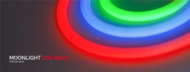Гибкий неон MOONLIGHT диаметром 25 мм в черной оболочке обладает равномерным свечением, направленным на 360°. С помощью MOONLIGHT D25 можно создать локальное и декоративное освещение, а также оригинальные арт-объекты. 3D-инсталляции на основе круглого гибкого неона гармонично впишутся в интерьеры объектов HoReCa и другие коммерческие пространства, а также в локации, где можно гармонично использовать многоцветность.