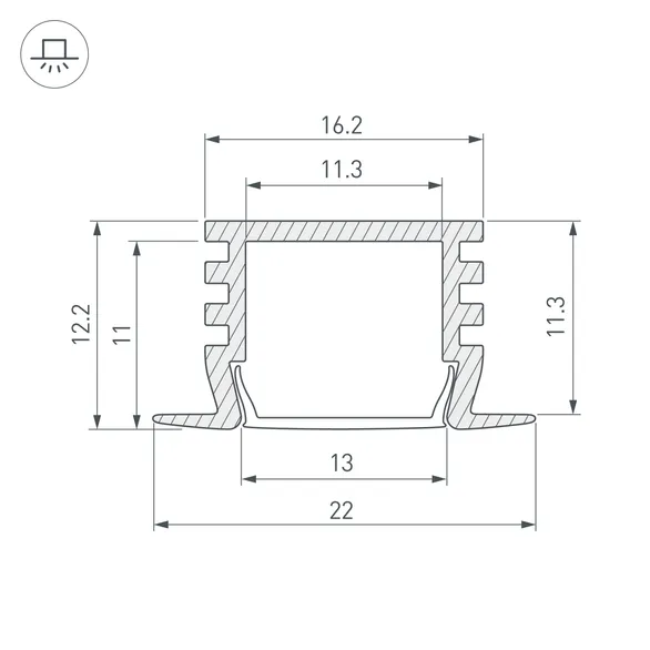 Габаритные размеры профиля составляют 2000 мм в длину, 22 мм в ширину и 12,2 мм в высоту. Площадка для установки светодиодных лент позволяет использовать ленту шириной до 11,3 мм и мощностью до 17 Вт/м. Это обеспечивает гибкость в выборе светодиодных лент и создает потрясающие световые решения.