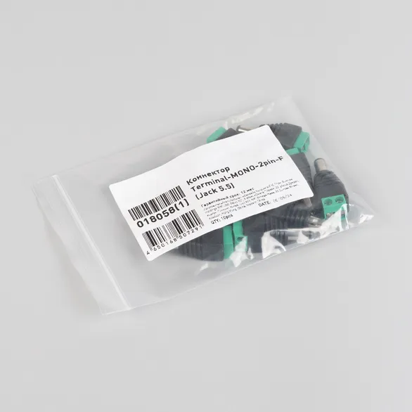 Клеммная колодка с DC-входом 5.5мм (напряжение не выше 48В), для быстрого подключения светодиодных лент к сетевым адаптерам. Одна сторона - клеммная колодка для провода (от ленты), другая сторона - DC-вход 5.5мм (мама) для штекера от сетевого адаптера. Позволяет подключать ленту без пайки. Номинальный ток 3 А.