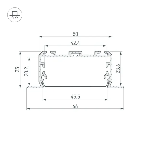 Габаритные размеры профиля составляют 2000 мм в длину, 66 мм в ширину и 25 мм в высоту. Площадка для установки светодиодных лент позволяет использовать ленту шириной до 48 мм и мощностью до 43,3 Вт/м. Это обеспечивает гибкость в выборе светодиодных лент и создает потрясающие световые решения.