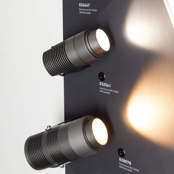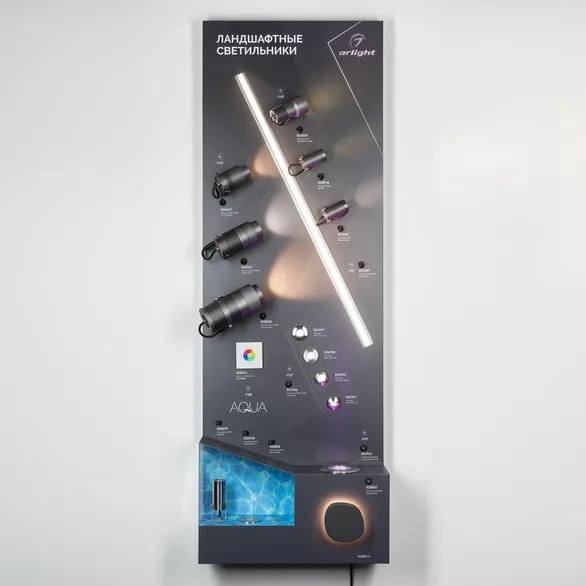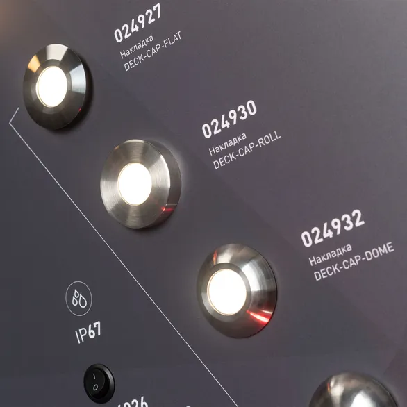 На стенде представлены ландшафтные светильники. Прожекторы серий RAY и RAY ZOOM. Грунтовые светильники LUMILINE и GROUND. Светильники для подсветки стен и пола серии DECK. Подводные светильники AQUA и WATER. Настенный светильник SWAMP.