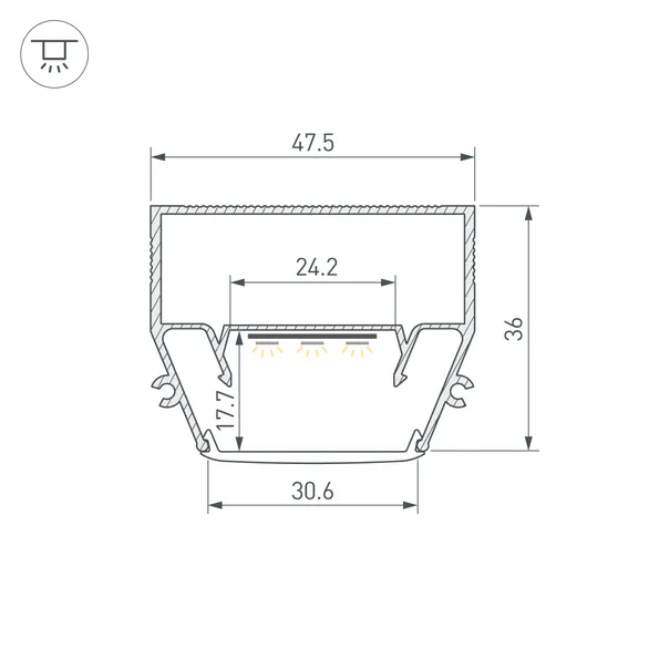 Габаритные размеры профиля составляют 2000 мм в длину, 47,5 мм в ширину и 36 мм в высоту. Площадка для установки светодиодных лент позволяет использовать ленту шириной до 24,2 мм и мощностью до 54 Вт/м. Это обеспечивает гибкость в выборе светодиодных лент и создает потрясающие световые решения.