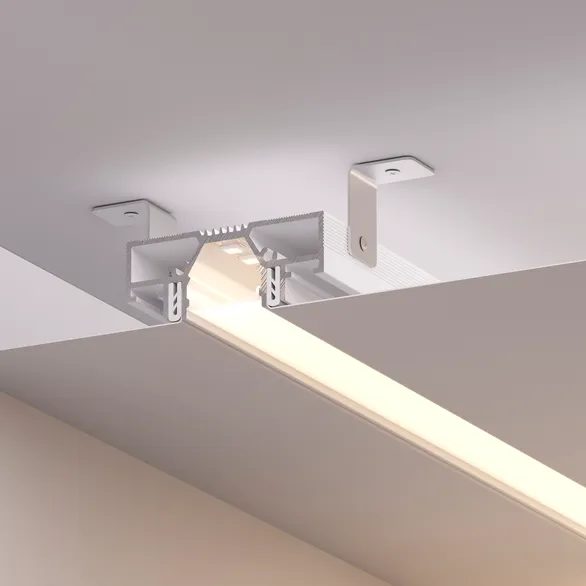 Алюминиевый профиль белого цвета - RAL9003 (порошковая окраска). Центральная линия света для дизайнерских решений в натяжных потолках. Решение 2-в-1: служит каркасом для крепления натяжного потолка и профилем для установки светодиодной ленты. Источник света находится вровень с плоскостью натяжного потолка. Демпферная система крепления полотна натяжного потолка подходит как для тканевых, так и для ПВХ полотен.