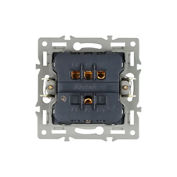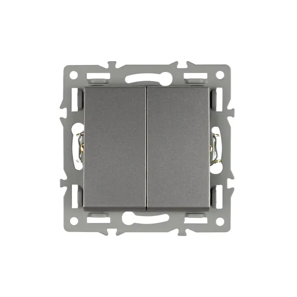 Механизм выключателя света двухклавишный на 1 пост, совместим с рамками серий VERSA/GLARE/PRESTO. Скрытый тип монтажа позволяет гармонично встроить в интерьер любого современного дизайн-проекта. Видимая часть механизма выполнена из высококачественного тугоплавкого пластика серого цвета. Контактная часть присоединяется при помощи винтовых зажимов, а усиленные монтажные лапки надежно фиксируют механизм в установочном подрозетнике. Степень защиты IP20 допускает использование устройства во влажных помещениях, с соблюдением требований эксплуатации.