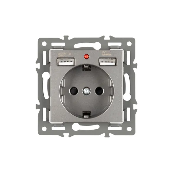 Механизм розетки с заземлением на 1 пост, совместим с рамками серий VERSA/GLARE/PRESTO. Помимо основного разъема, так же предусмотрено два выхода USB Type-A. Накладной тип монтажа позволяет с легкостью произвести монтаж/замену. Видимая часть механизма выполнена из высококачественного тугоплавкого пластика серого цвета. Контактная часть присоединяется при помощи винтовых зажимов, а усиленные монтажные лапки надежно фиксируют механизм в установочном подрозетнике. Степень защиты IP20 допускает использование устройства во влажных помещениях, с соблюдением требований эксплуатации.
