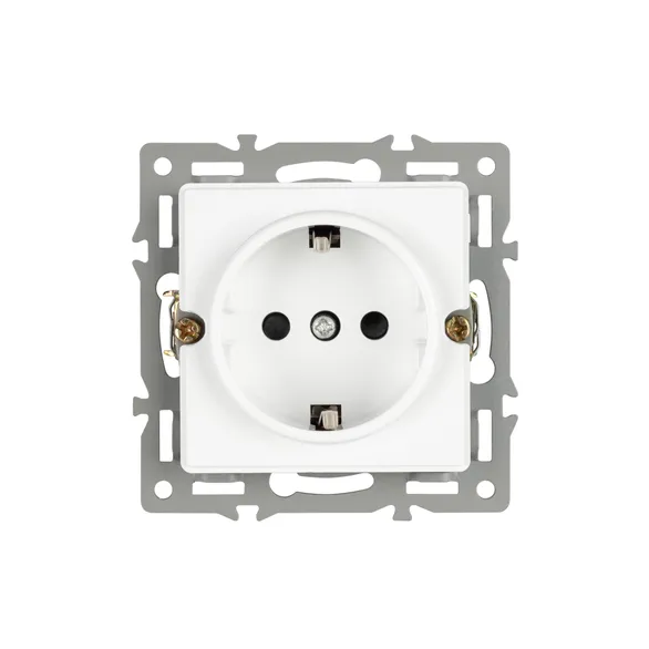 Механизм розетки с заземлением на 1 пост, совместим с рамками имеющими круглый вырез серии GLARE/PRESTO. Скрытый тип монтажа позволяет гармонично встроить в интерьер любого современного дизайн-проекта. Видимая часть механизма выполнена из высококачественного тугоплавкого пластика белого цвета. Контактная часть присоединяется при помощи винтовых зажимов, а усиленные монтажные лапки надежно фиксируют механизм в установочном подрозетнике. Степень защиты IP20 допускает использование устройства во влажных помещениях, с соблюдением требований эксплуатации.