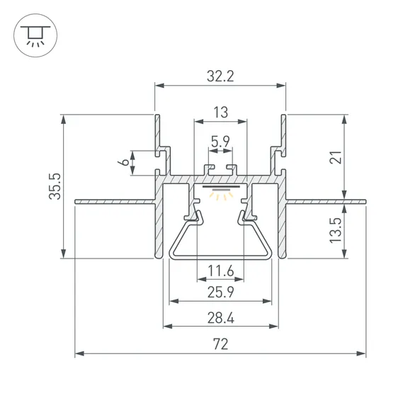 Габаритные размеры профиля составляют 2000 мм в длину, 72 мм в ширину и 35,5 мм в высоту. Площадка для установки светодиодных лент позволяет использовать ленту шириной до 13 мм и мощностью до 40 Вт/м. Это обеспечивает гибкость в выборе светодиодных лент и создает потрясающие световые решения.