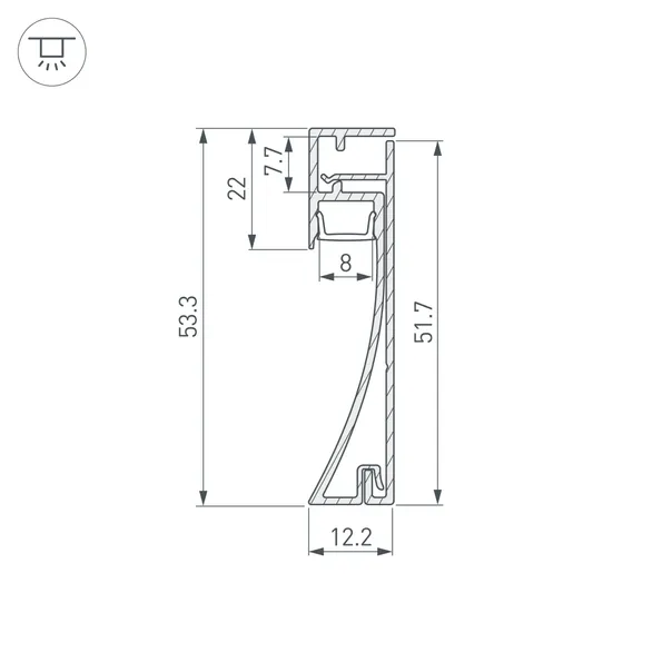 Накладной двухкомпонентный профиль-плинтус из анодированного алюминия для контурной подсветки помещения. Габаритные размеры профиля составляют 2000 мм в длину, 12,2 мм в ширину и 53,3 мм в высоту. Площадка для установки светодиодных лент позволяет использовать ленту шириной до 8 мм и мощностью до 20 Вт/м. Это обеспечивает гибкость в выборе светодиодных лент и создает потрясающие световые решения.