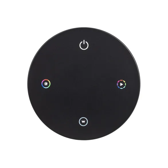 Кнопочный радиочастотный пульт чёрного цвета, предназначенный для управления мультицветными (RGB/RGBW) источниками света. Поддерживает основные функции: включение и выключение света, регулировку яркости, управление цветом, запуск и настройка динамических программ. Устройство совместимо с диммерами и контроллерами серии SMART, поддерживающими управление по радиоканалу 2.4G. К одному пульту возможно привязать неограниченное количество диммеров и контроллеров. Устройство поддерживает 1 зону управления. Питание 3В осуществляется от батарейки CR2032. Корпус пульта выполнен из пластика, защищающего от загрязнения. Магнитное основание в комплекте. Габариты устройства 75x75x18 мм.