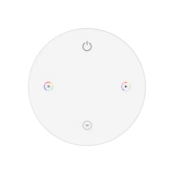 Кнопочный радиочастотный пульт белого цвета, предназначенный для управления мультицветными (RGB/RGBW) источниками света. Поддерживает основные функции: включение и выключение света, регулировку яркости, управление цветом, запуск и настройка динамических программ. Устройство совместимо с диммерами и контроллерами серии SMART, поддерживающими управление по радиоканалу 2.4G. К одному пульту возможно привязать неограниченное количество диммеров и контроллеров. Устройство поддерживает 1 зону управления. Питание 3В осуществляется от батарейки CR2032. Корпус пульта выполнен из пластика, защищающего от загрязнения. Магнитное основание в комплекте. Габариты устройства 75x75x18 мм.