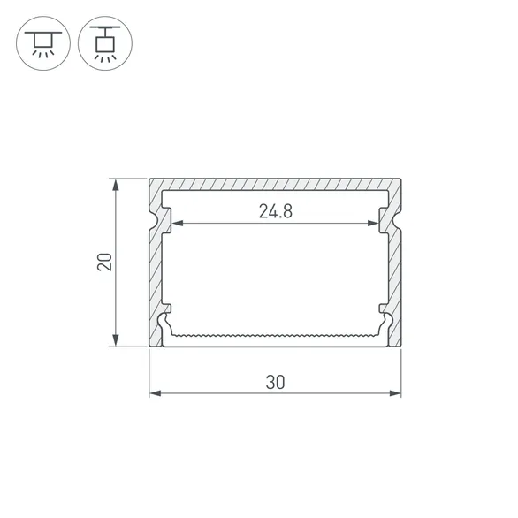 Накладной профиль из анодированного алюминия для контурной или основной подсветки. Габаритные размеры профиля составляют 2000 мм в длину, 30 мм в ширину и 20 мм в высоту. Площадка для установки светодиодных лент позволяет использовать ленту шириной до 24 мм и мощностью до 26,6 Вт/м. Это обеспечивает гибкость в выборе светодиодных лент и создает потрясающие световые решения.