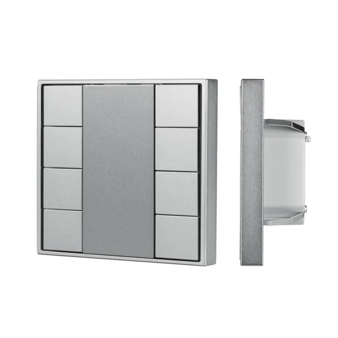 Встраиваемая металлическая панель серая цвета с кнопочным управлением, предназначенная для работы с контроллерами в системах управления светом DALI-2. Напрямую не управляет исполнительными устройствами. Все команды от панели обрабатываются только мастер-контроллерами DALI. Позволяет программировать 8 кнопок и 16 светодиодных индикатора статусов. Удобное и точное управление при помощи отдельных механических кнопок для каждой функции. Питание от шины DALI. Габариты устройства составляют 80х80х26.6 мм.