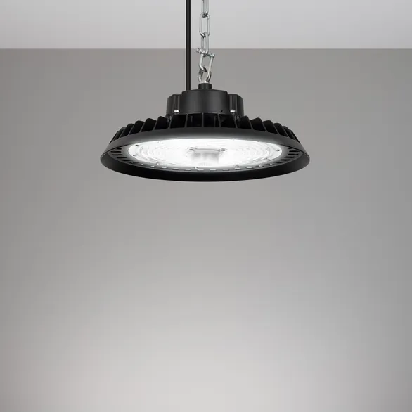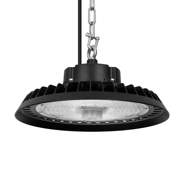 Светильник SP-ARIVA-MOTION мощностью 150 Вт, дневного цвета свечения 5000K, световым потоком 22500 лм и углом рассеивания 90 градусов предназначен для освещения складских и промышленных помещений. Черный цвет корпуса, габариты Ф300xH140 мм, степень пылевлагозащиты IP65., индекс цветопередачи CRI 80, степень ударопрочности IK08. Рым-болт в комплекте. Датчик настраивается с помощью пульта 052018 (один на все датчики). Доступно управление по протоколу 0-10В.