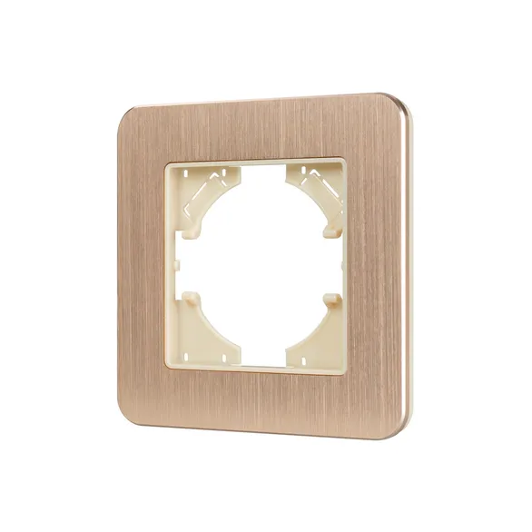 Рамка из серии AKIRY представляет собой комбинацию в виде основы из тугоплавкого пластика и 3-х миллиметровой накладки из алюминиевого сплава. Корпус выполнен в золотом цвете и сатинированной поверхностью с высотой 7мм, что позволяет гармонично встроить в интерьер любого современного дизайн-проекта. Невидимая часть из тугоплавкого пластика, для надежной фиксации механизма. Грани алюминиевой накладки аккуратно обработаны и отшлифованы, чтобы обезопасить пользователя при установке и демонтаже.