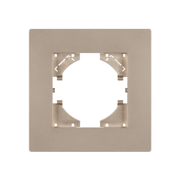 Рамка из серии PERIO изготовлена из высококачественного пластика. Корпус выполнен в золотом цвете и матированным покрытием с высотой 7мм, что позволяет гармонично встроить в интерьер любого современного дизайн-проекта. Предназначена под встраиваемые механизмы.