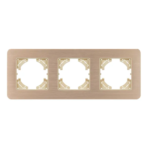Рамка из серии AKIRY представляет собой комбинацию в виде основы из тугоплавкого пластика и 3-х миллиметровой накладки из алюминиевого сплава. Корпус выполнен в золотом цвете и сатинированной поверхностью с высотой 7мм, что позволяет гармонично встроить в интерьер любого современного дизайн-проекта. Невидимая часть из тугоплавкого пластика, для надежной фиксации механизма. Грани алюминиевой накладки аккуратно обработаны и отшлифованы, чтобы обезопасить пользователя при установке и демонтаже.