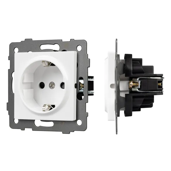 Механизм розетки с заземлением совместим с рамками серий OMALI/AKYRI/PERIO/XSILO. Скрытый тип монтажа позволяет гармонично встроить в интерьер любого современного дизайн-проекта. Видимая часть механизма выполнена из высококачественного пластика белого цвета. Контактная часть присоединяется при помощи винтовых зажимов, а усиленные распорные лапки надежно фиксируют механизм в установочном подрозетнике.