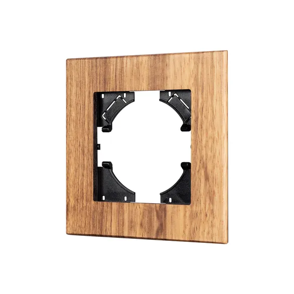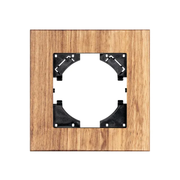 Рамка из серии XSILO изготовлена из комбинации высококачественного пластика и натурального дерева. Корпус выполнен в черном цвете с накладкой из лакированного дерева,. Высота изделия в таком случае составляет 7 мм, что позволяет гармонично разместить в интерьер любого современного дизайн-проекта. Предназначена под встраиваемые механизмы.
