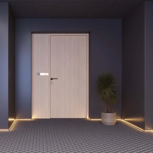 Накладной алюминиевый анодированный профиль-плинтус черного цвета для контурной подсветки стены.