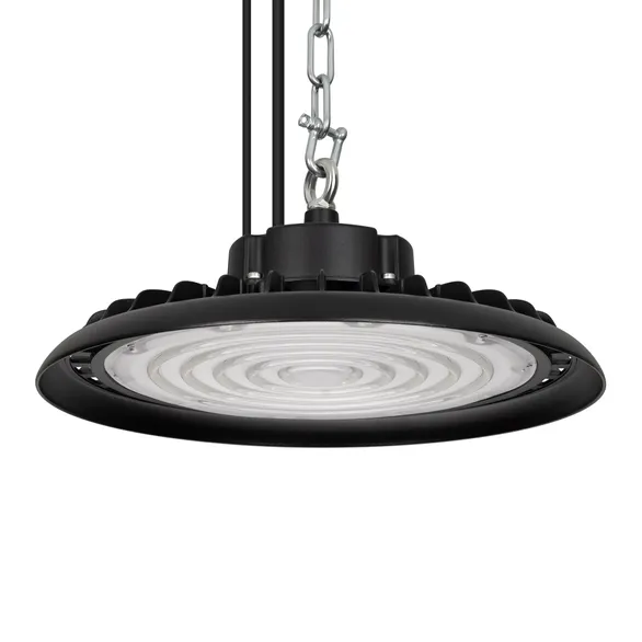 Светильник SP-ARIVA-DIM мощностью 200 Вт, дневного цвета свечения 5000K, световым потоком 30000 лм и углом рассеивания 90 градусов предназначен для освещения складских и промышленных помещений. Черный цвет корпуса, габариты Ф350xH140 мм., степень пылевлагозащиты IP65., индекс цветопередачи CRI 80, степень ударопрочности IK08. Доступно управление по протоколу 0-10В. Рым-болт в комплекте.