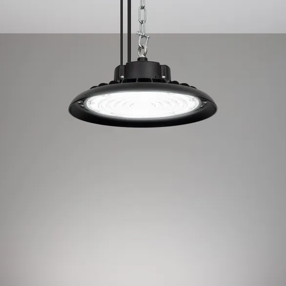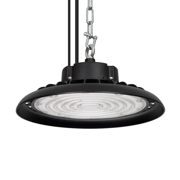 Светильник SP-ARIVA-DIM мощностью 150 Вт, дневного цвета свечения 5000K, световым потоком 22500 лм и углом рассеивания 60 градусов предназначен для освещения складских и промышленных помещений. Черный цвет корпуса, габариты Ф300xH140 мм., степень пылевлагозащиты IP65., индекс цветопередачи CRI 80, степень ударопрочности IK08. Доступно управление по протоколу 0-10В. Рым-болт в комплекте.