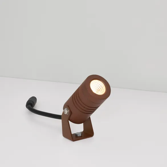 Уличный светодиодный прожектор RAY мощностью 5 Вт предназначен для организации локального освещения элементов фасадов зданий и сооружений, малых архитектурных форм, деревьев и зеленых насаждений. Поворотная конструкция корпуса позволяет мгновенно регулировать направление света в вертикальной плоскости в диапазоне 135 градусов. Узкий угол излучения дает возможность решать задачу точечного освещения объектов. Ударопрочный корпус выполнен из алюминия с устойчивым анодно-оксидным покрытием. Оптический блок закрыт прочным экраном из закаленного стекла толщиной 3мм. Степень пылевлагозащиты IP67 рассчитана на длительное использование на открытом воздухе, обеспечивая надежную работу в неблагоприятных условиях. Встроенный драйвер позволяет быстро подключить светильник к сети 230В, а для удобства монтажа в комплект входит провод длиной 1м. Возможна установка в грунт или на поверхность при помощи основания-пики или круглого основания (приобретаются отдельно).