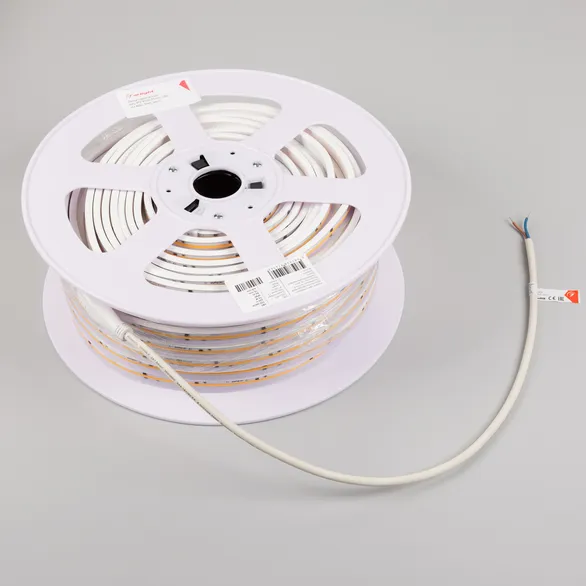 Светодиодная герметичная лента ARL сплошного свечения серии X720 со степенью защиты IP65, защитная оболочка из ПВХ устойчива к УФ излучению, что позволяет использовать ее на улице. Высокая плотность светодиодов X720 позволяет создать эффект сплошной идеальной линии света без применения рассеивающих экранов. Лента подключается непосредственно к сети переменного тока 230 В и не требует использования источников питания. Наличие интегральных стабилизаторов тока позволяет подключать ленту длиной до 50 м, обеспечивая при этом равномерную яркость свечения по всей длине ленты. При подключении нескольких лент необходимо подавать питание на каждые 50 м отдельным кабелем, последовательное подключение лент более 50 м запрещается. Лента применяется для подсветки потолочных ниш, декоративной подсветки, создания контуров рекламных объектов, может использоваться в помещениях и на улице. На лентах установлены микросхемы с функцией снижения тока для защиты ленты от перегрева, обеспечивающие надежную работу в различных условиях. Диммирование осуществляется диммерами TRIAC в диапазоне 30%-90%. Крепление с помощью скоб, аксессуары для монтажа и подключения поставляются отдельно.