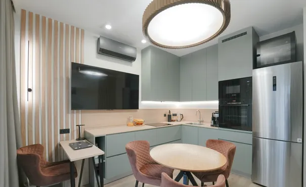 Освещение в двухкомнатной квартире спроектировано с учетом функциональности, комфорта и эстетики. Используется многоуровневая система света.