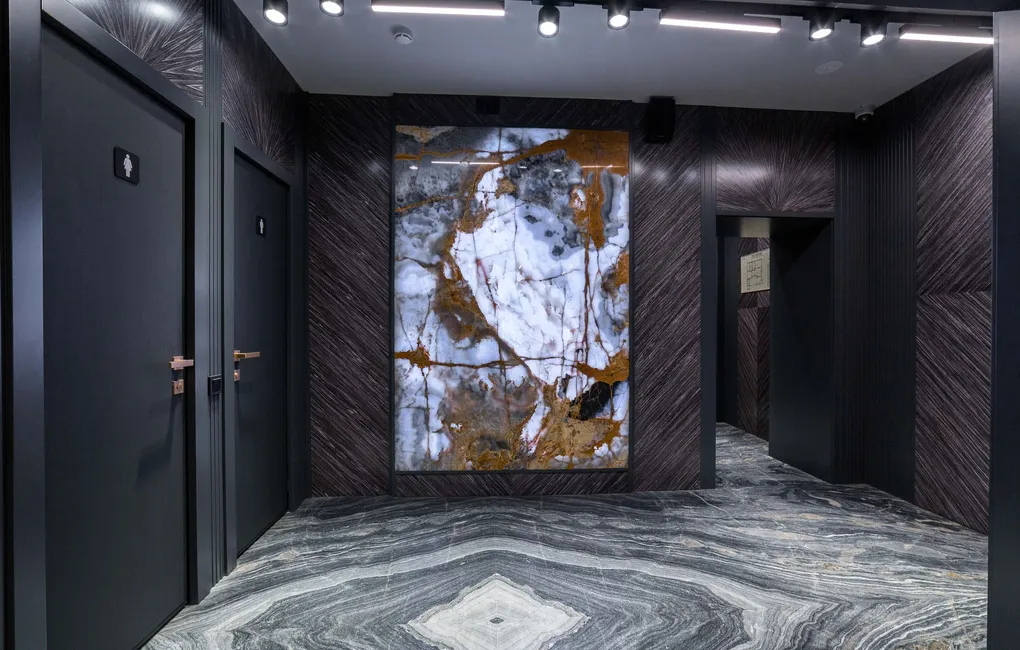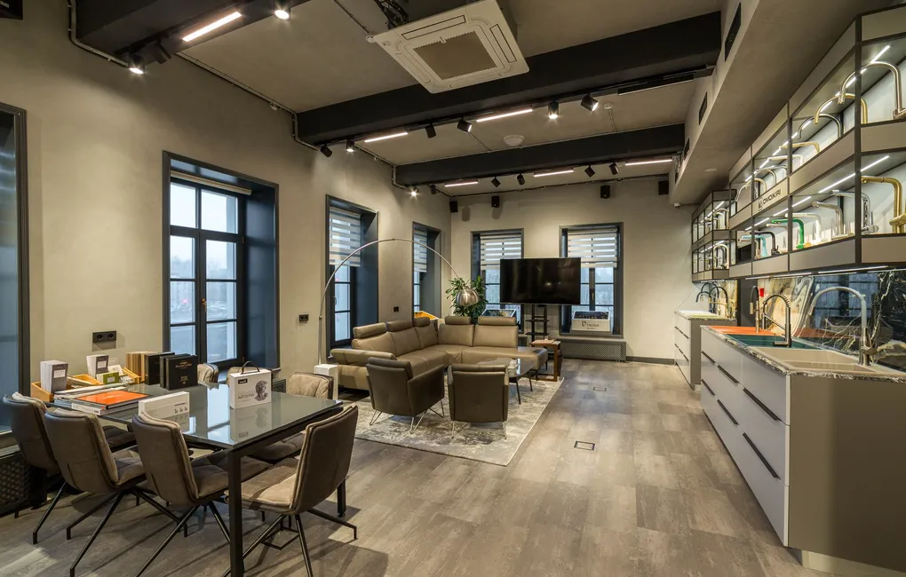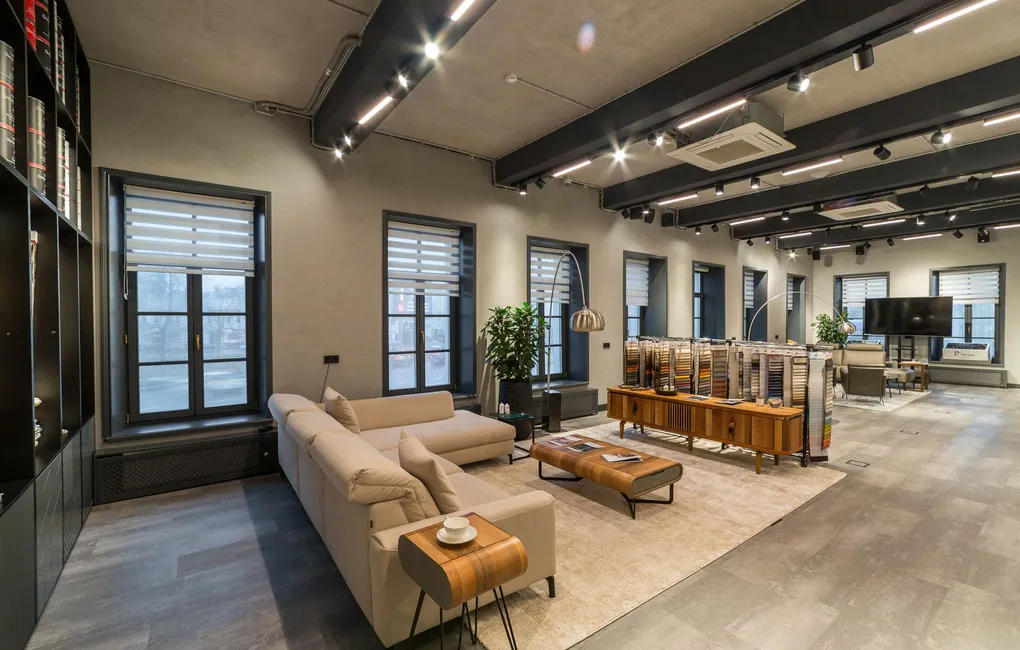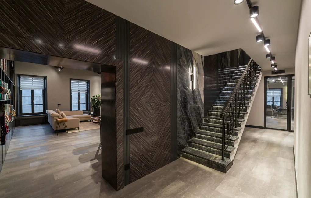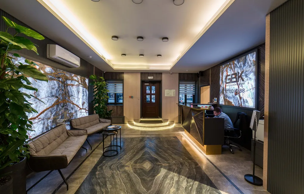 На этом проекте дизайнерам предстояло не просто оформить рабочее помещение в Москве. Нужно было распланировать пространство, в котором разместились кабинеты, переговорные и даже шоурум с продукцией клиента — мебелью и изделиями из камня.
