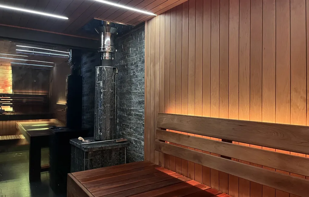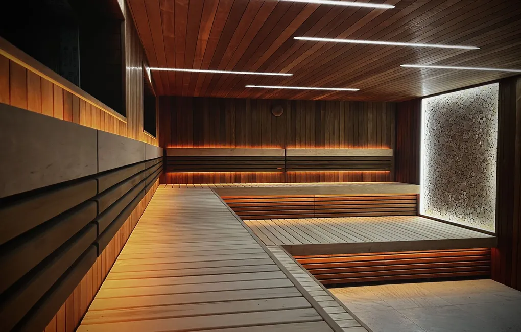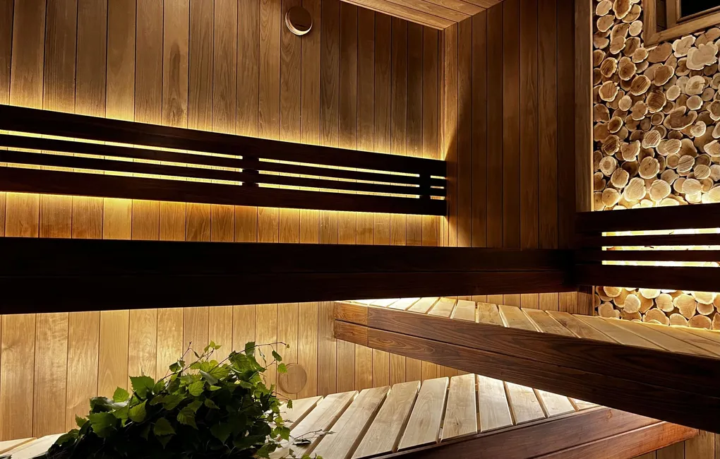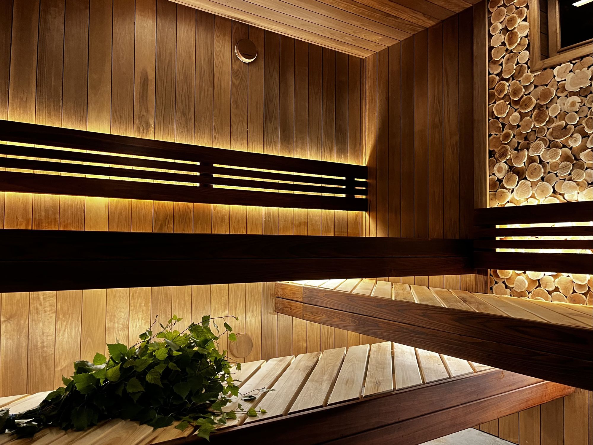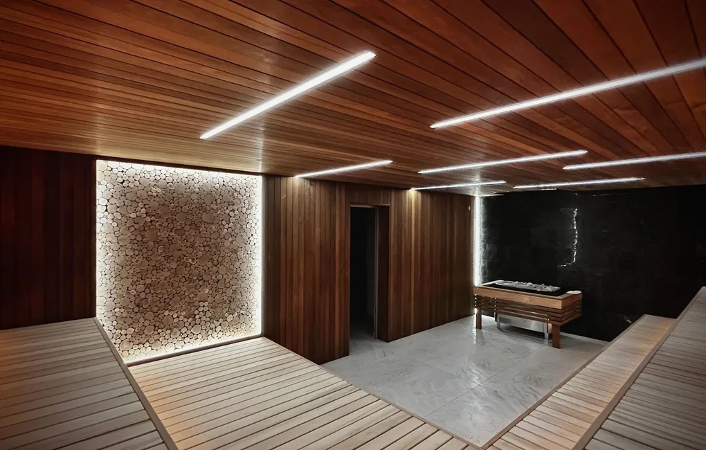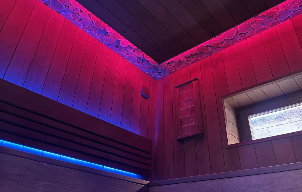 Премиальные банные пространства, где эстетика сочетается с высокими технологиями в освещении. Для настроения и атмосферы выбраны RGB-светодиодные ленты с мягкими переливами цвета.