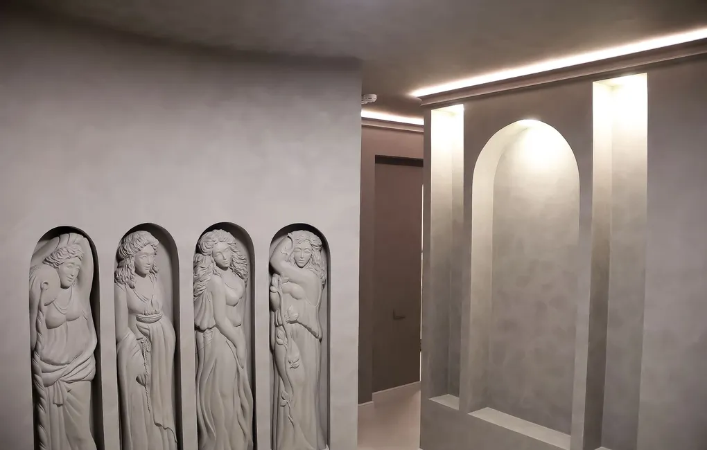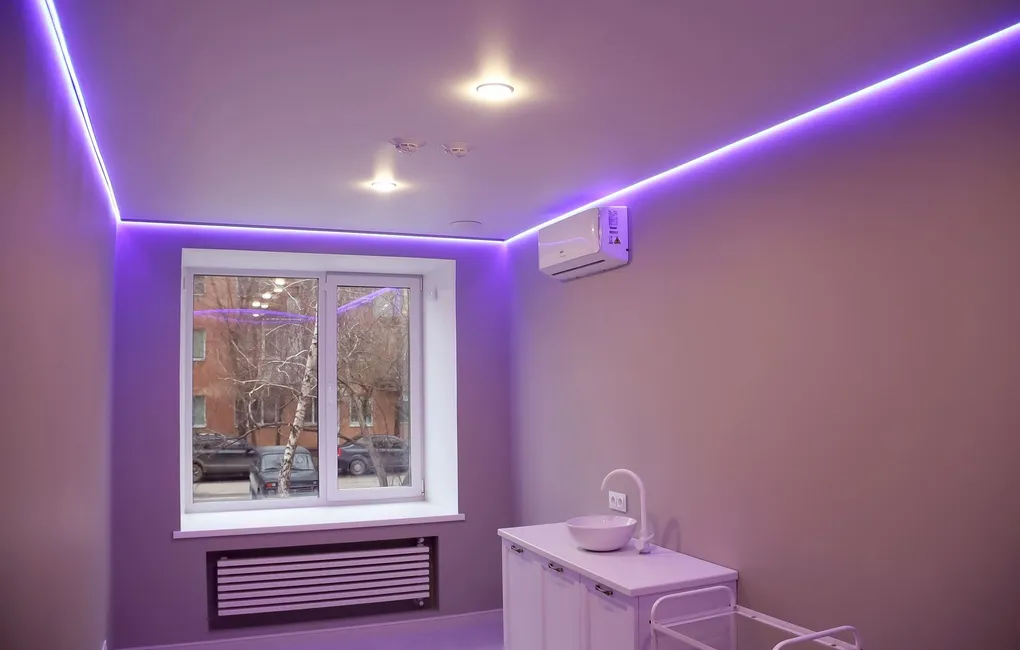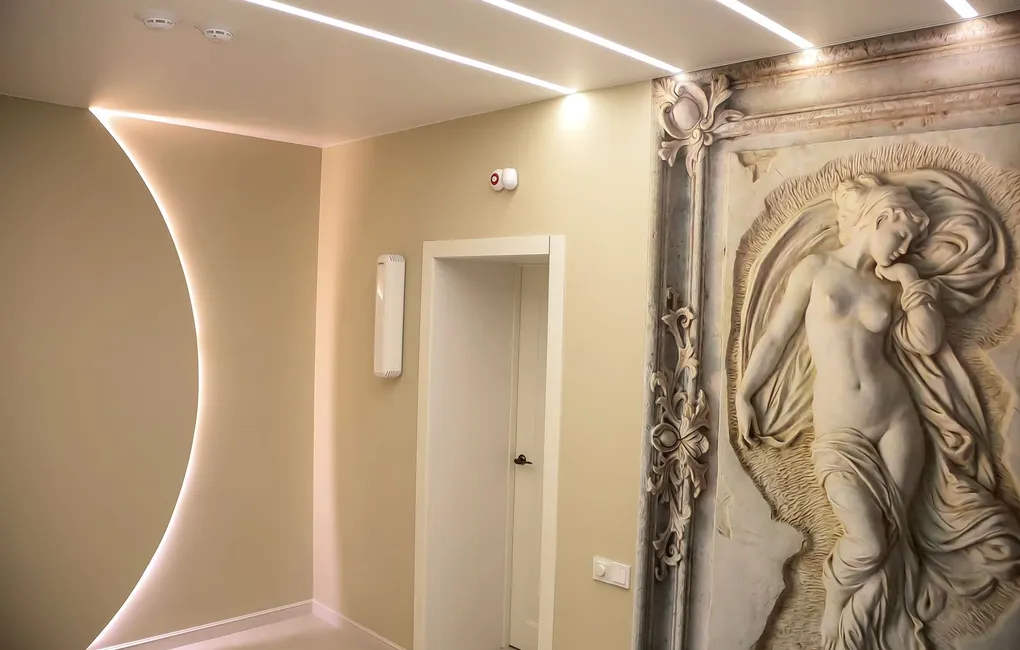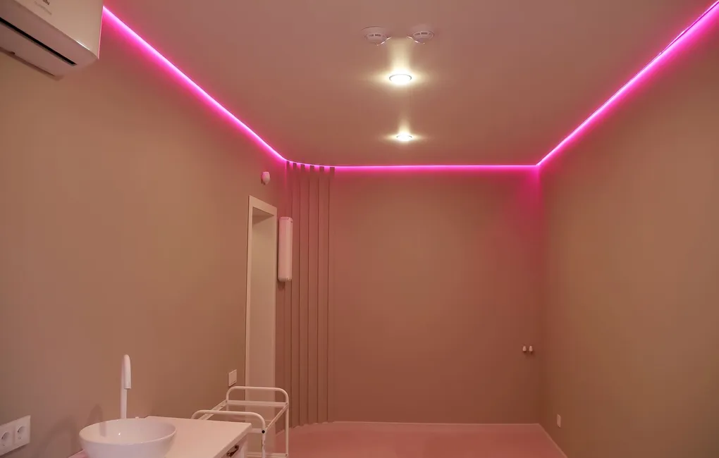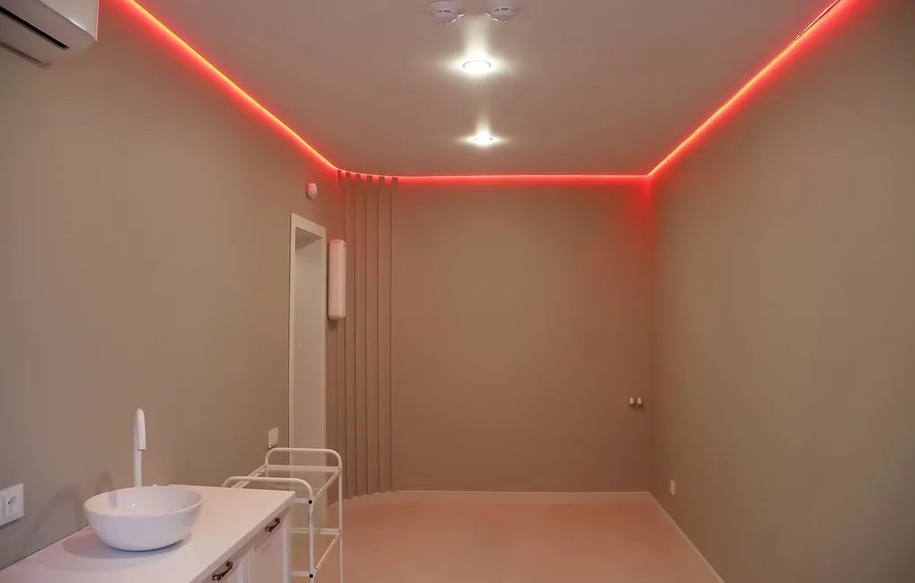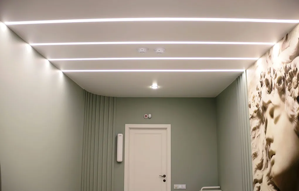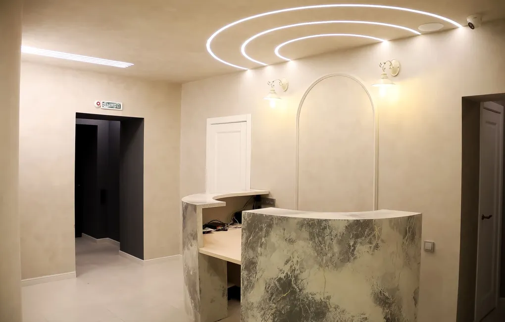 Свет в интерьере клиники соответствует общей концепции дизайна. В отделке использованы холодные оттенки белого и серого, которые подчеркиваются нейтральным дневным светом (4000 К).