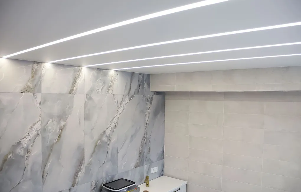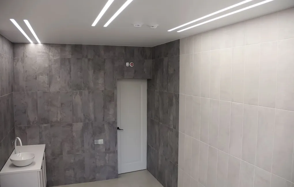 Минималистичный стиль интерьера отражен в освещении: компактные, энергоэффективные светильники обеспечивают комфорт для работы персонала. Основное решение — линейные модели на основе LED-лент и алюминиевых профилей. Такие профильные светильники создают равномерное освещение, сохраняя легкость пространства. В технических зонах и входных группах также соблюден единый стиль.