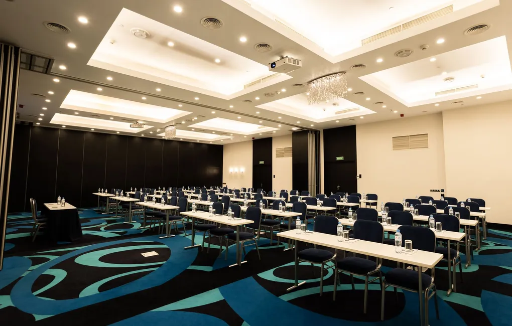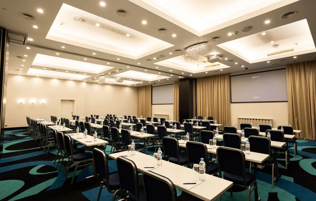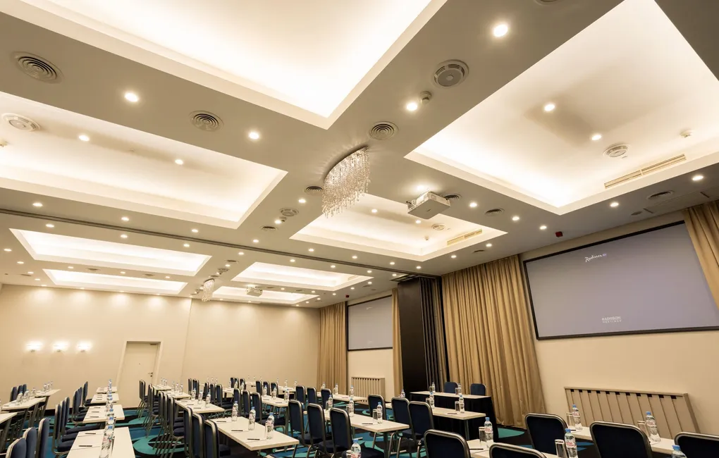 Освещение конференц-зала проектируется с учетом многофункциональности пространства: в нем проводят презентации, видеоконференции, совещания и торжественные мероприятия. Применение световых сценариев — один из ключевых пунктов для создания такого многообразия.