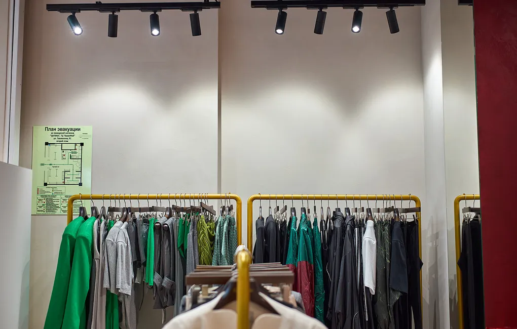 Реализация: дизайнер Гозель Хакимуллина подобрала индивидуальное освещение для каждой зоны магазина. Так, прозрачные кирпичики около кассы она подчеркнула мультицветной светодиодной лентой MINI серии F120. Саму одежду осветили с использованием светильников линейки ARTEMIS с дневной температурой свечения — как раз для того, чтобы не искажать цвета представленных моделей.