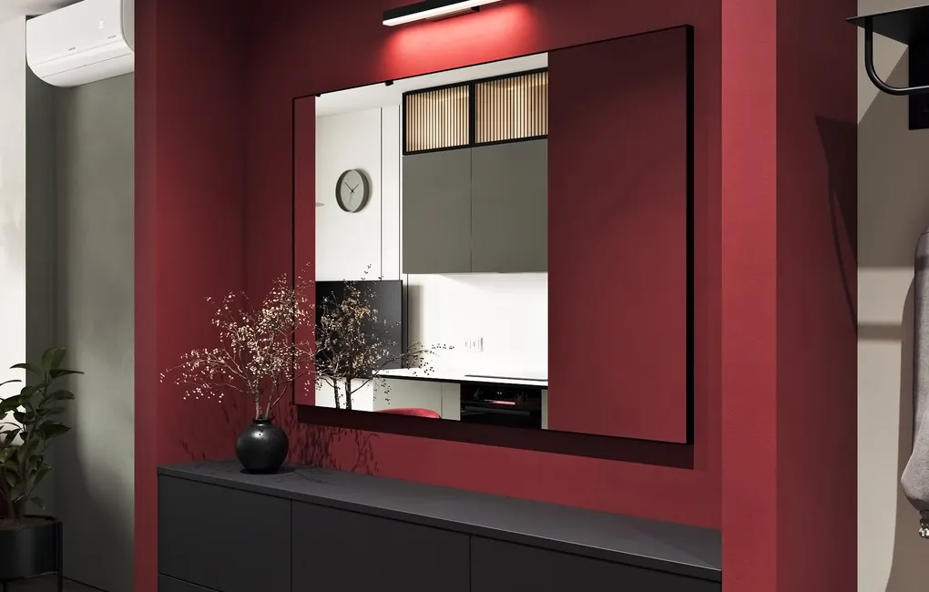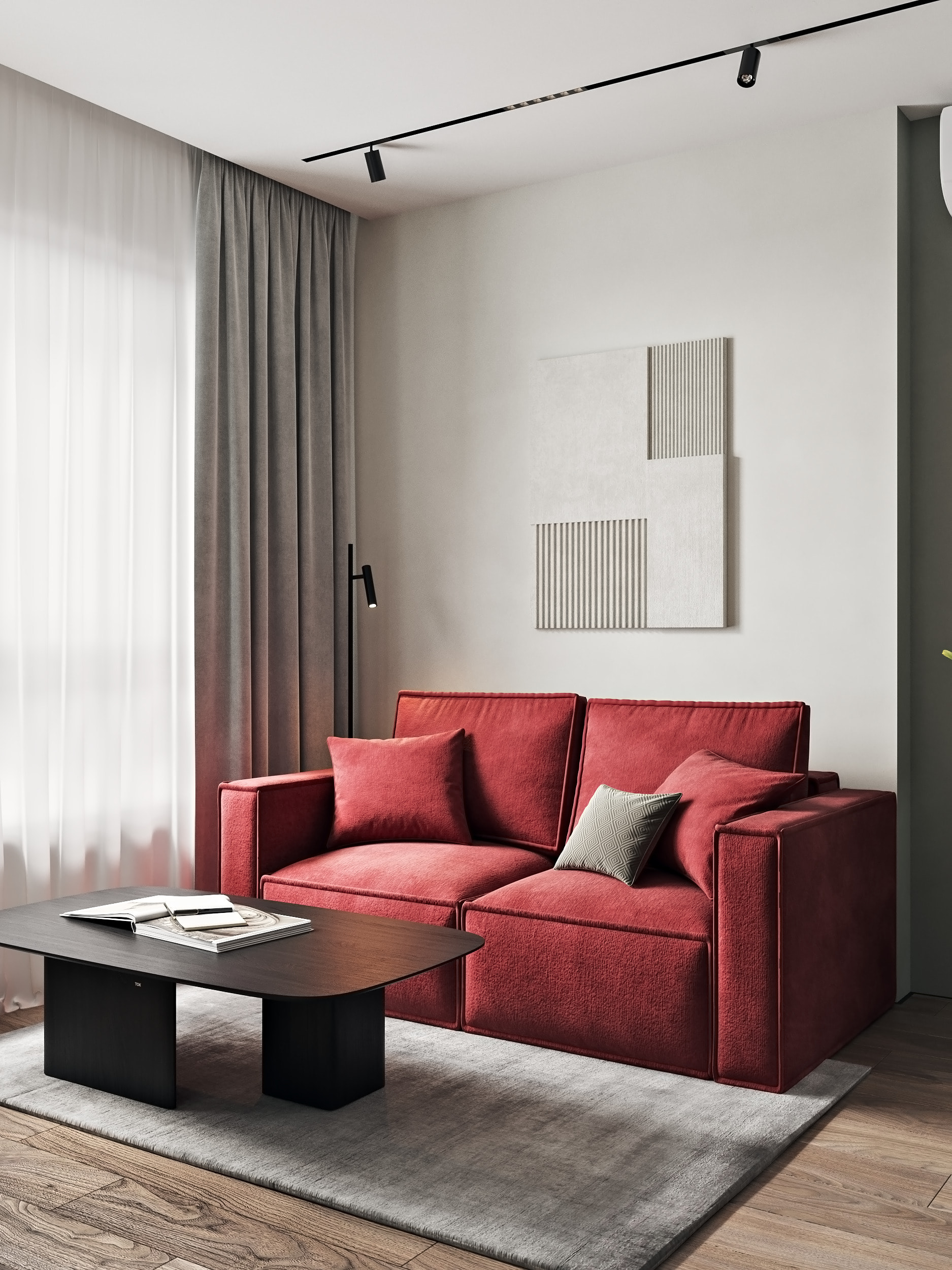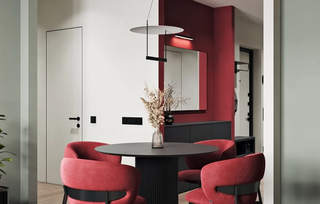Реализация: полная демонтажная подготовка после получения базовой отделки от застройщика, включая снятие натяжных потолков и обновление базовых элементов. Разработка дизайн-проекта руководителем студии Flat Design Артемом Поповым. Концепция интерьера основывалась на ярком, динамичном стиле с акцентом на индивидуальность. В качестве отправной точки — использование насыщенных цветовых решений: бледно-мятного и бордового оттенков, которые создают уютную и живую атмосферу. В интерьере применены графичные светильники, ручки, выключатели и смесители с выразительным дизайном, что добавляет уникальности.