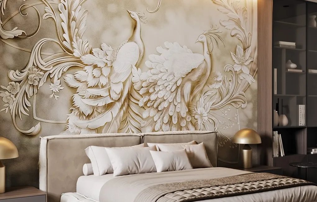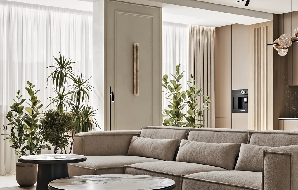 Цветовая палитра построена на светлых природных оттенках с черными графичными элементами и латунными акцентами.