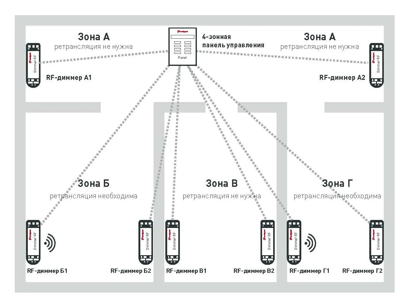 Исходя из вышенаписанного, ретрансляция необходима, если хоть одно расстояние между панелью управления и RF-диммером больше эффективного расстояния устойчивой связи.